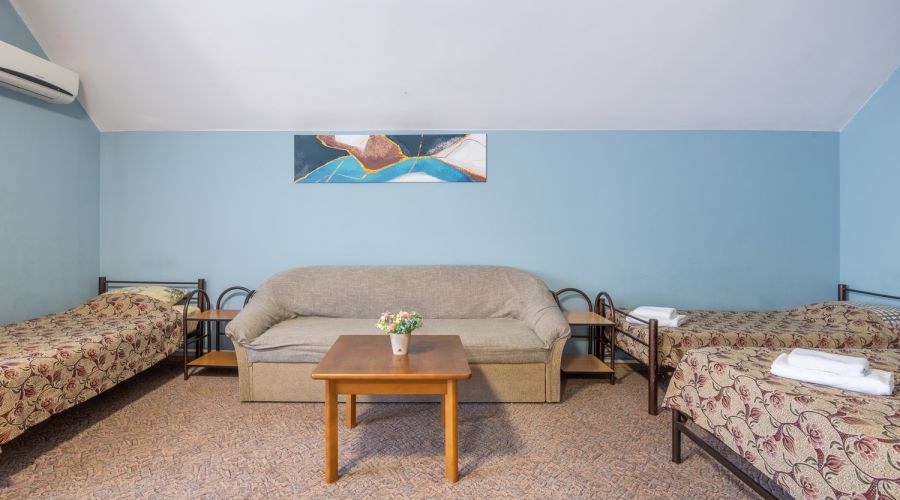 | Семейный семейный бюджетный | 29 кв.м. | 6 чел. | Балкон, Мебель (вешалка, диван, зеркало, кровати односпальные, кровать двуспальная, прикроватные тум... | |